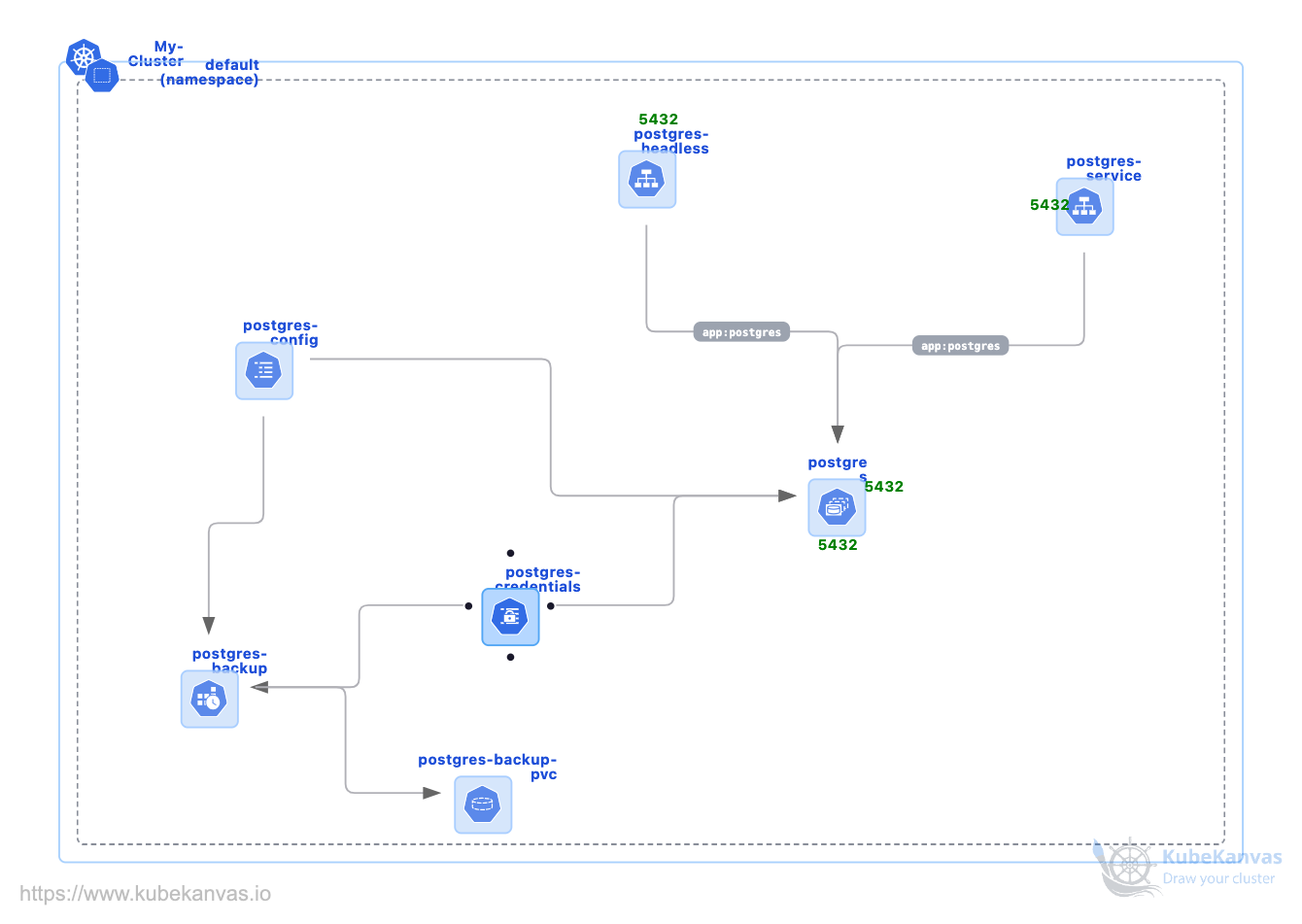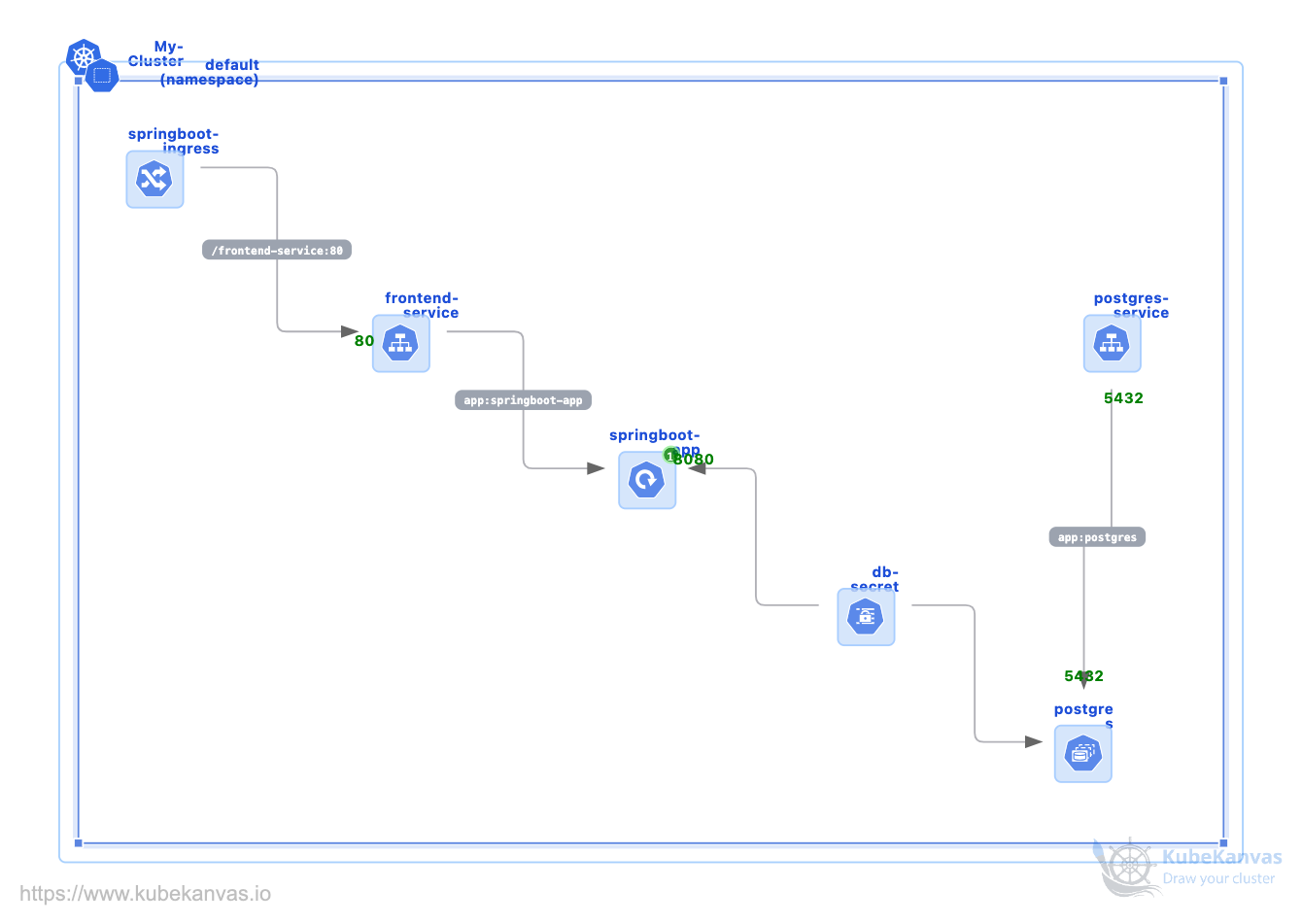 In this template, well walk through the deployment of a Spring Boot application with a persistent PostgreSQL database.The deployment was managed via **kubekanvas** (a visual kubernetes IDE) . Here are the "pillars" of our K8s setup: