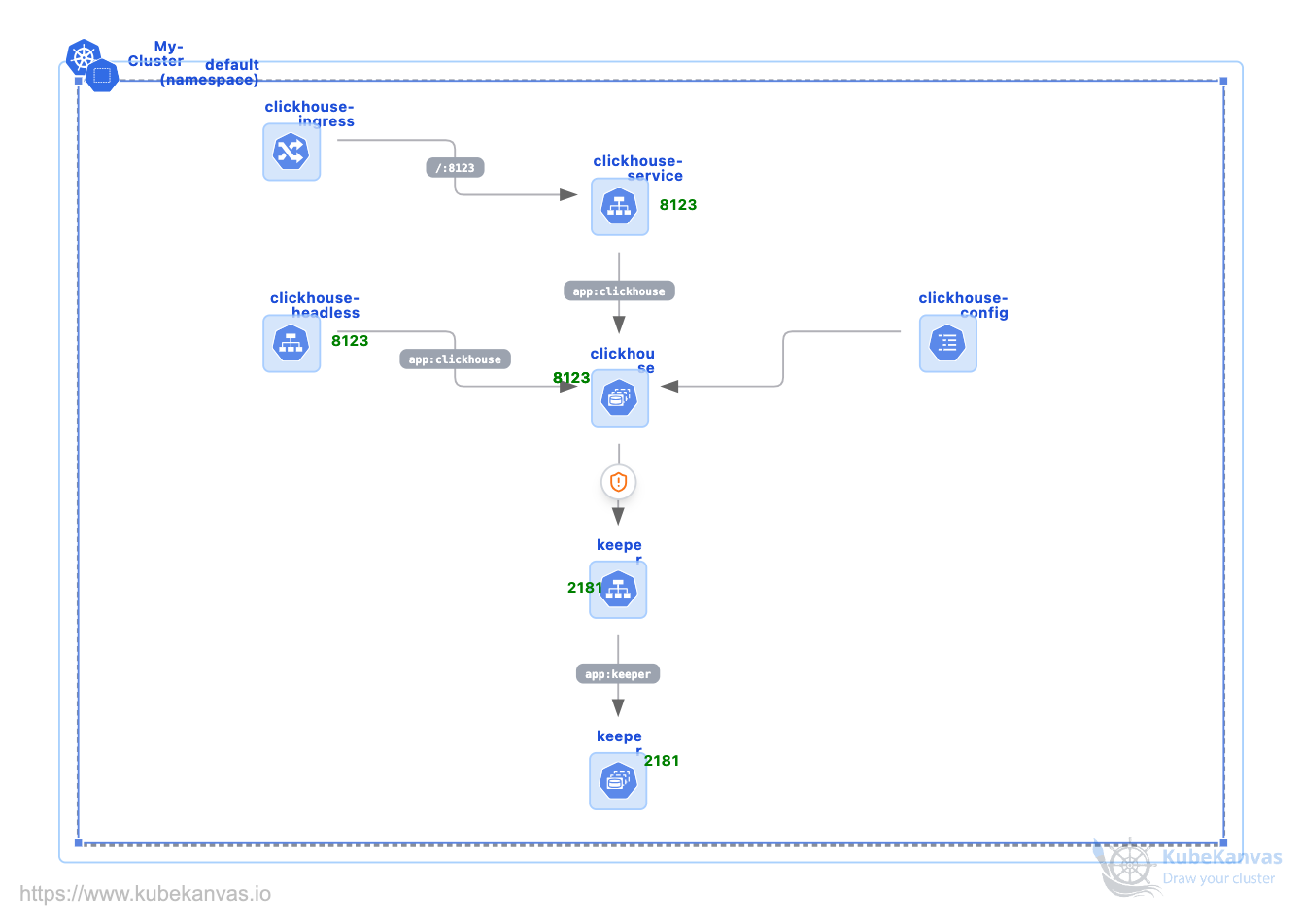 | **StatefulSet (Keeper)** | 1-node coordination engine for metadata. |